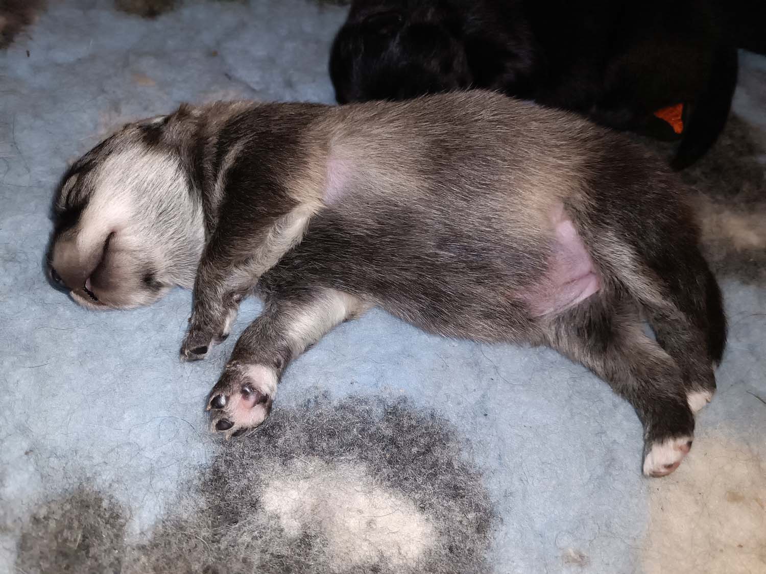 Bei der 3. Hündin bin ich mir noch nicht sicher welche Farbe sie mal haben wird. Ich denke schwarz, die Besitzerin vom Deckrüden meint sie erkenne ganz dezente Tan-Abzeichen. Ich sehe sie nicht wirklich, ich könnte theoretisch einen Gen-Test machen, dauert etwa 4-5 Wochen, bis dahin vermute ich aber dass wenn es wirklich tan abzeichen sind, sie deutlicher werden. Diese Abzeichen bilden sich auch erst innerhalb des ersten Lebensjahres richtig aus.